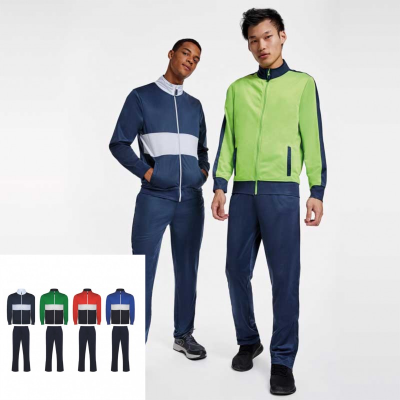Fato de treino tricolor com interior aveludado. Casaco com bolsos laterais. Fecho central comprotetor de queixo. Cintira elastica e cordao ajustavel.